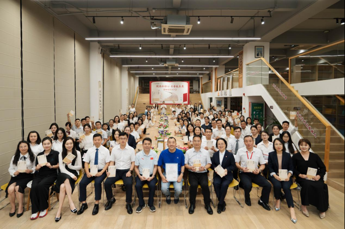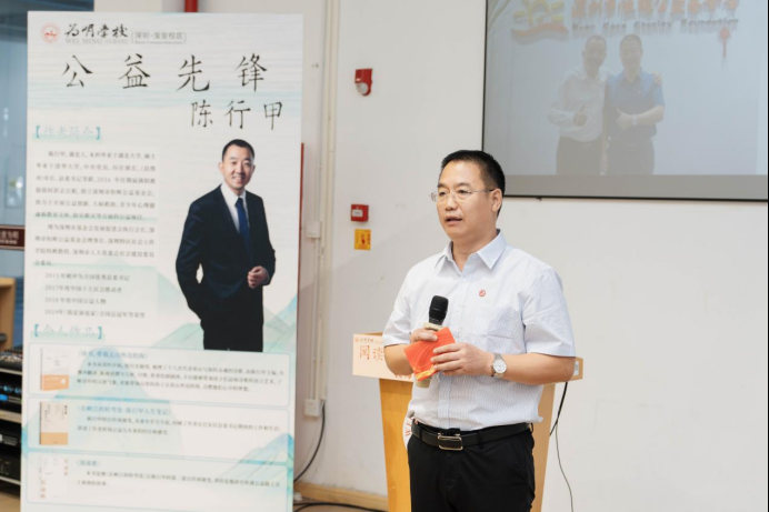 在教師個人閱讀心得分享環節,初中部主任段占忠代表全體老師用文字走近陳行甲,他講述了陳行甲發起的“聯愛”“知更鳥計劃”“傳薪計劃”等多個公益項目,贊嘆陳老師是教育的同行者,更是先進教育理念的領跑者,因此特聘陳行甲老師為寶安為明學校“教育公益領航導師”。